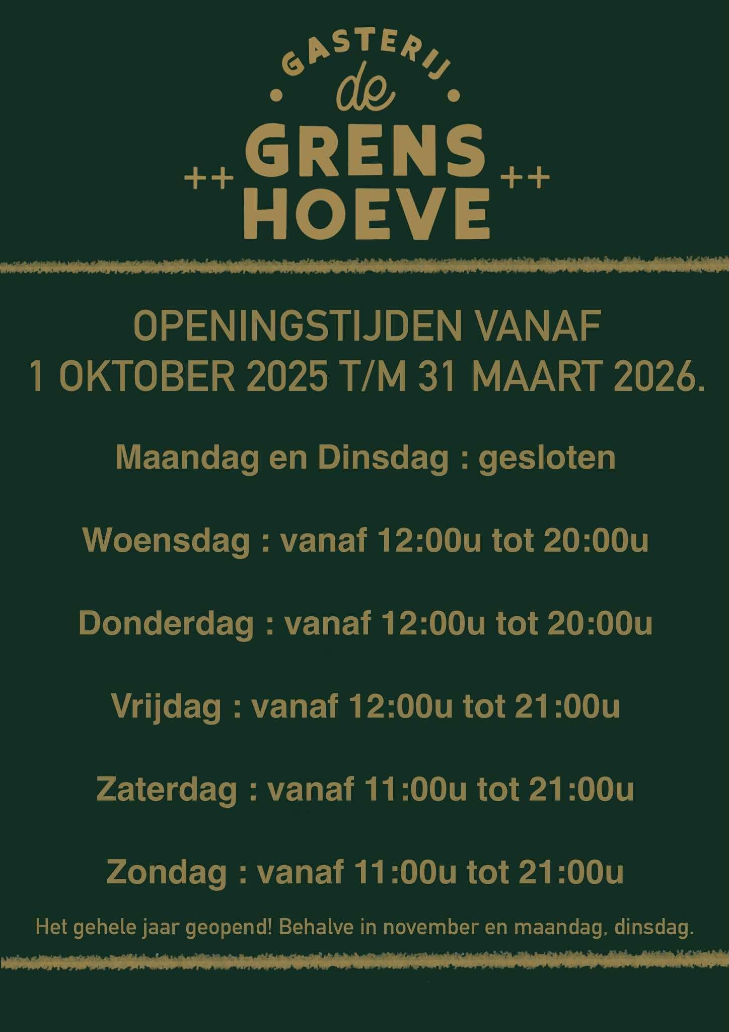 In de maand november zijn wij gesloten in verband met onze vakantie. Verder zijn we op de reguliere dagen (maandag en dinsdag) gesloten. Houd onze website en social media in de gaten voor eventuele afwijkende openingstijden tijdens feestdagen of speciale evenementen.